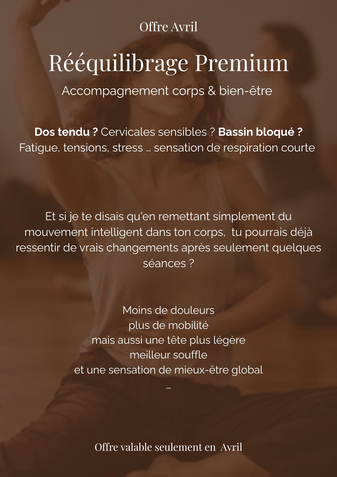 Il permet de remettre du mouvement de manière progressive et intelligente, d’installer de nouvelles bases et surtout de te faire ressentir concrètement les bénéfices d’un accompagnement personnalisé.